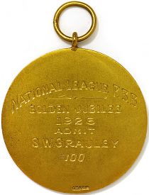 Medallion engraved - National League P.B.B., Golden Jubilee, 1925, Admit S.W. Grauley, #100. The Grauley family was infamous in the Philadelphia Sports Writer circle. We found none with the middle initial W.