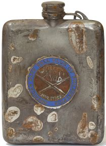 Sterling flask - American Base Ball Club of Philadelphia, circle logo featuring the white elephant, crossed bats, and the club name Athletics, 5 ¾" H.