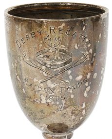 Closeup of a sterling English 1869 sculling trophy, London, 1868, Richards & Brown. 1869 was a banner year for the sport of rowing. The first international matches were held. Quickly this event gained popularity. Close inspection of this University Scratch Fours 1st Prize March, 1869 trophy opens a surprise door. Keep reading, rowing.
