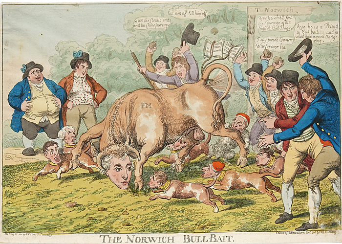 "The Norwich Bull-Bait" Hand Colored Etching by Charles Williams